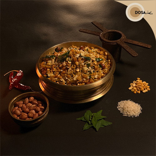 Ingredients – plain sev (omapodi), kara boondi, fried nuts (such as peanuts and cashews), poha (aval), chana dal, and curry leaves.